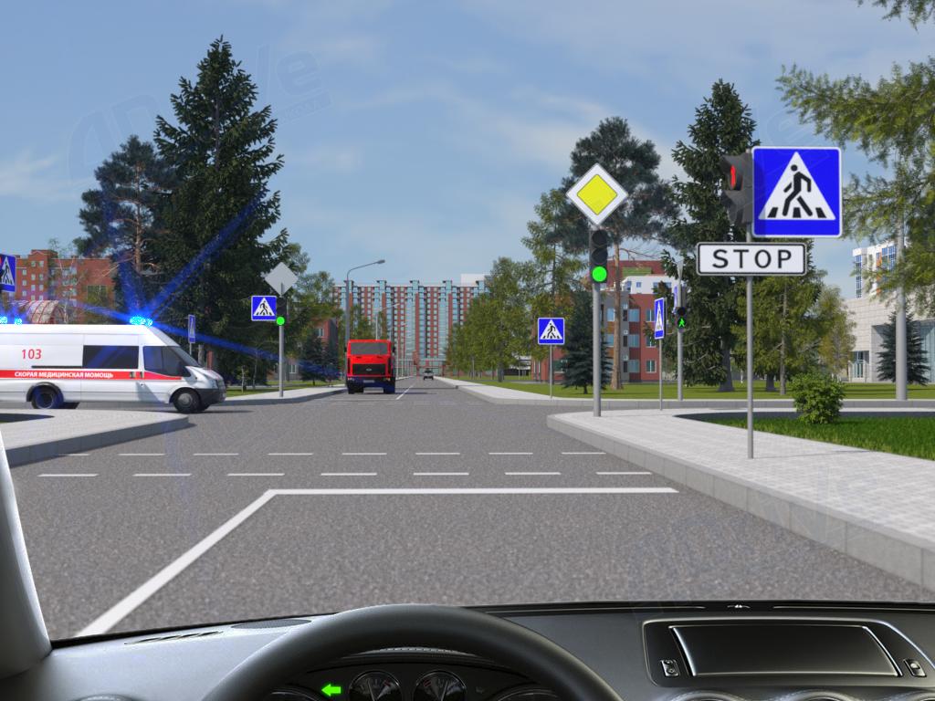 Приближающемуся транспортному средству оперативного назначения с включёнными маячками синего цвета необходимо уступить дорогу независимо от сигналов дорожного светофора на перекрёстке. Также при повороте налево на зелёный сигнал светофора необходимо уступить дорогу встречному автомобилю, движущемуся прямо или поворачивающему направо.