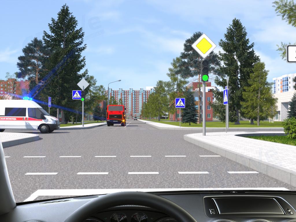 Вы обязаны уступить дорогу транспортному средству оперативного назначения, движущемуся с включёнными маячками синего цвета. Водитель грузового автомобиля, поворачивающий налево со встречного направления, обязан Вам уступить дорогу.