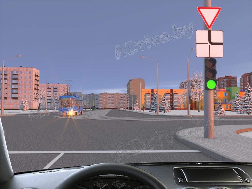 В показанной ситуации, двигаясь на разрешающий сигнал светофора, Вы должны уступить дорогу трамваю, так как в равных условиях трамвай имеет преимущество перед другими транспортными средствами.