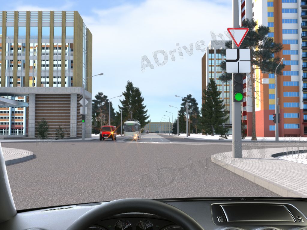 Двигаясь прямо на разрешающий сигнал светофора, Вы обязаны уступить дорогу только трамваю, поскольку в равных условиях он пользуется преимуществом.