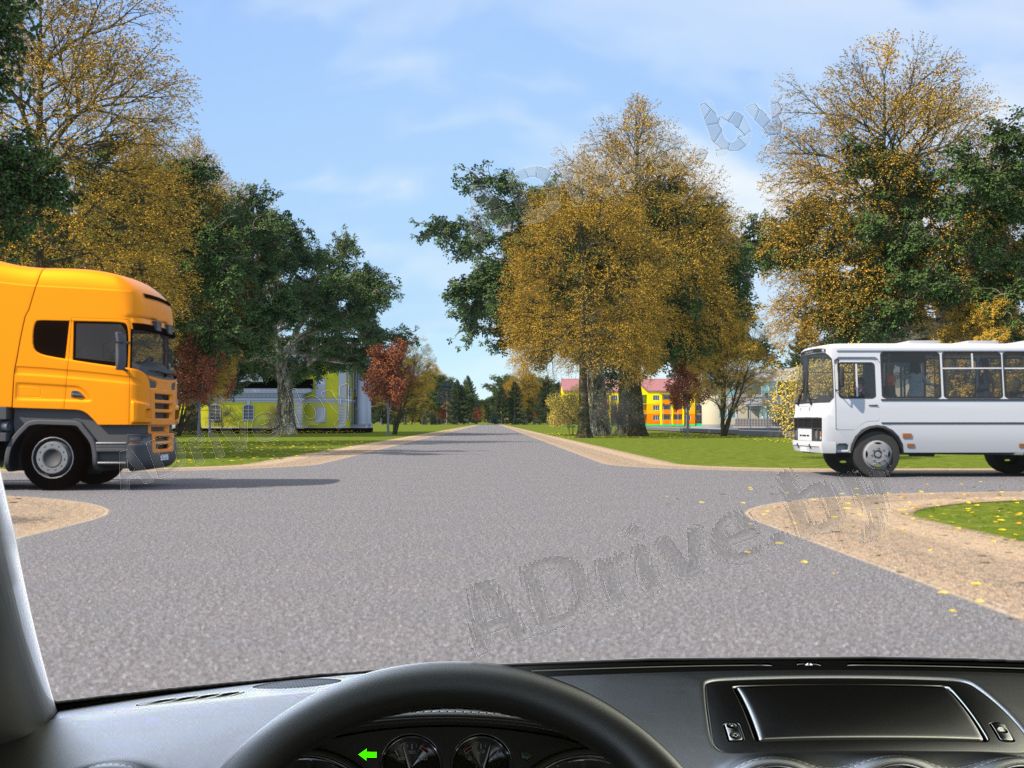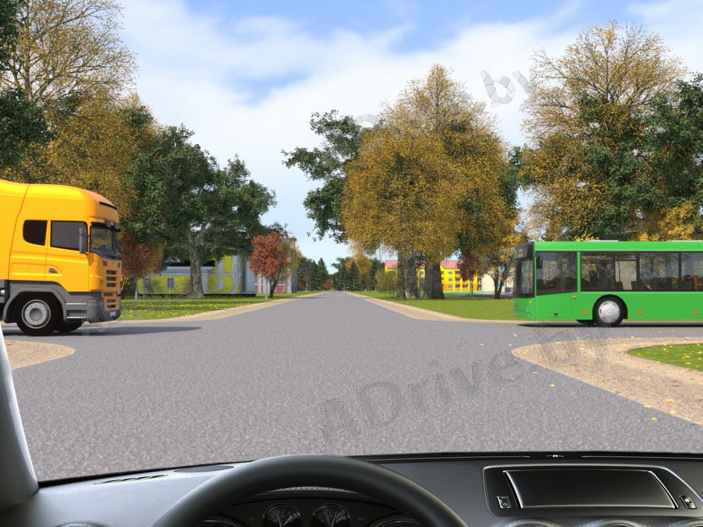В показанной ситуации Вы вместе с грузовым автомобилем и автобусом находитесь на равнозначных дорогах, поэтому при движении прямо обязаны уступить дорогу только автобусу, так как автобус приближается справа.