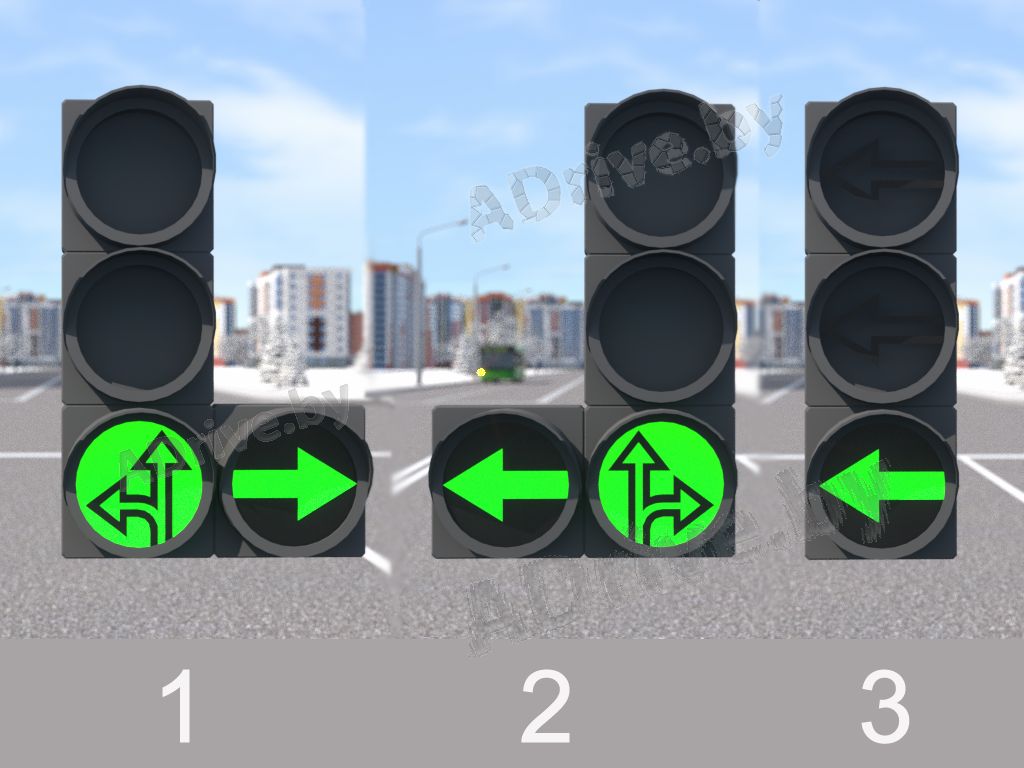 Какой из дорожных светофоров с показанными разрешающими сигналами предоставляет водителю при повороте налево преимущество перед транспортными средствами, движущимися с других направлений?