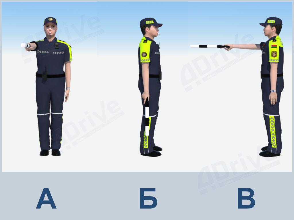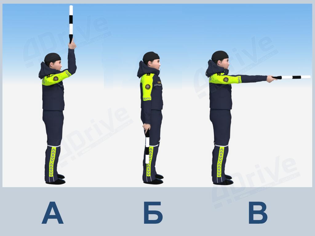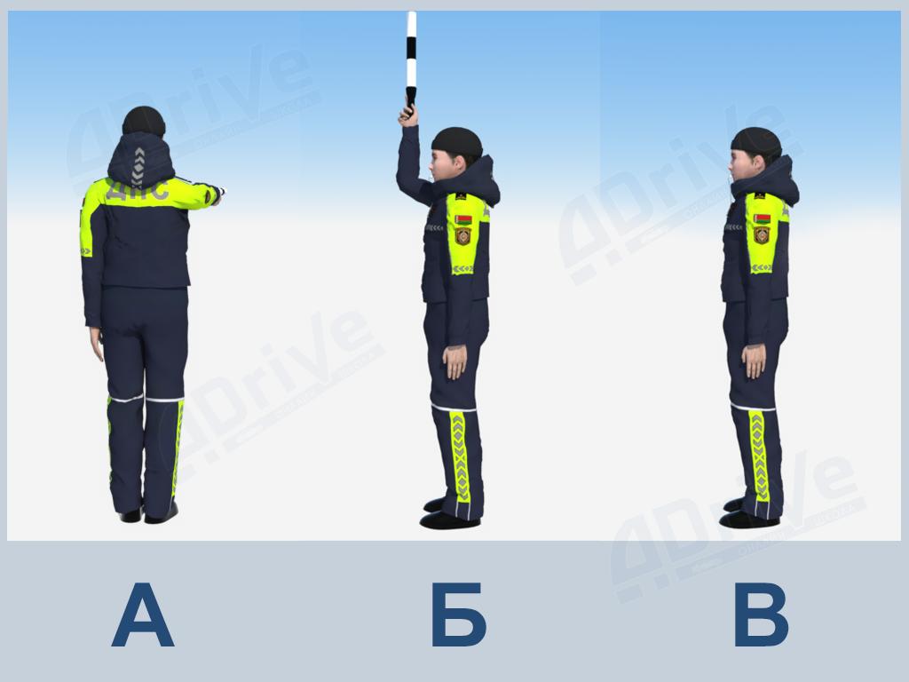 При показанных жестах пешеходам разрешено переходить проезжую часть дороги слева от регулировщика только если регулировщик находится в положении «Б» или «В».