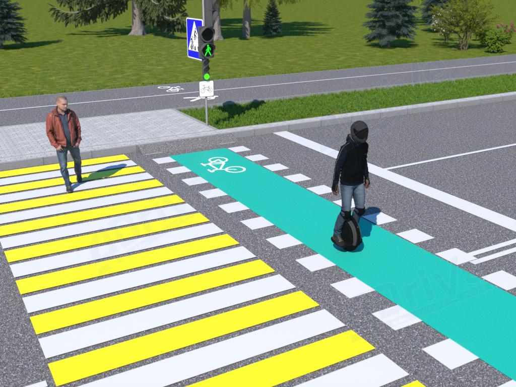 9. Обязан ли водитель средства персональной мобильности, пересекая проезжую часть дороги по велосипедному переезду, в показанной ситуации двигаться со скоростью идущего шагом пешехода?