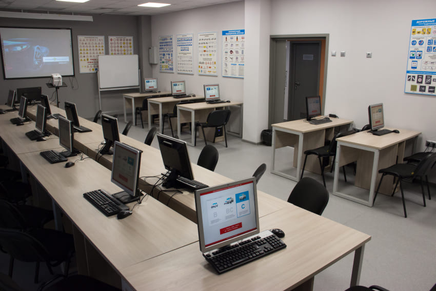 Обучение теории проходит в комфортных мультимедийных классах, а практика осваивается на современных автомобилях