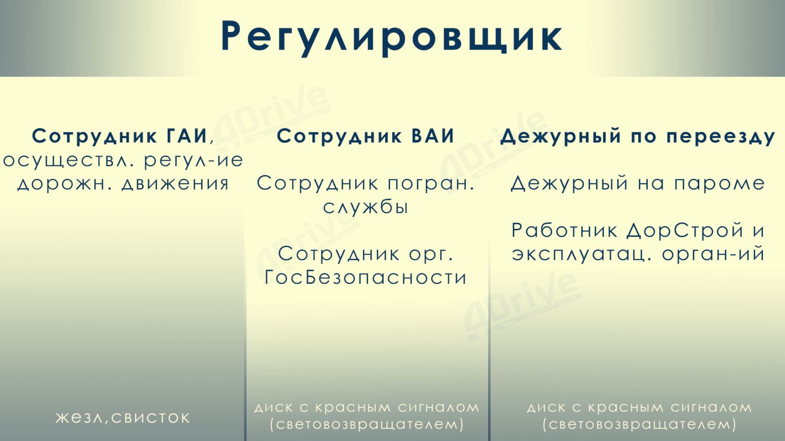 - регулировщик (сотрудник ГАИ, сотрудник ВАИ и прочие приравненные),